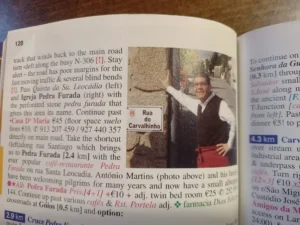 Jól elbeszélgettünk, a témáról és mutatta, hogy melyik szállásokat ajánlja, felhívta a figyelmemet, hogy érdemes az emelkedőket is belekalkulálni a tervezésbe. Antonio megnyugtatott, hogy a belső út jobb, mint az óceán parti, mert ilyenkor ott fúj az északi szél, ami még kellemetlenebb lehet. Biztatott, hogy a hátralévő 10 napban még meg tudom csinálni a túrát.